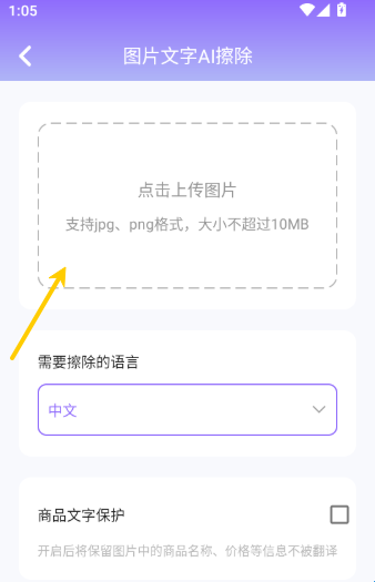 3、然后就可在“AI擦除”界面的方框中点击“上传图片”按钮来进行下一步。