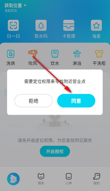 1、打开自助洗衣站点app,点击同意隐私政策