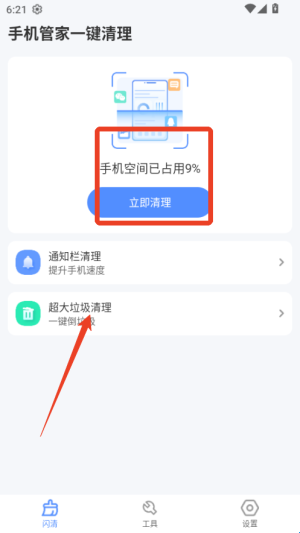 1、下载手机管家一键清理app并打开,在主界面点击一键清理按钮,快速清除手机缓存和垃圾文件。