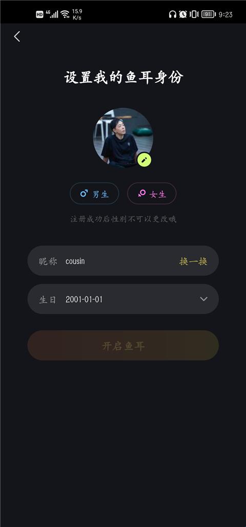 2、接下来用户可以设置自己的身份,包括性别、昵称、生日等基本信息。