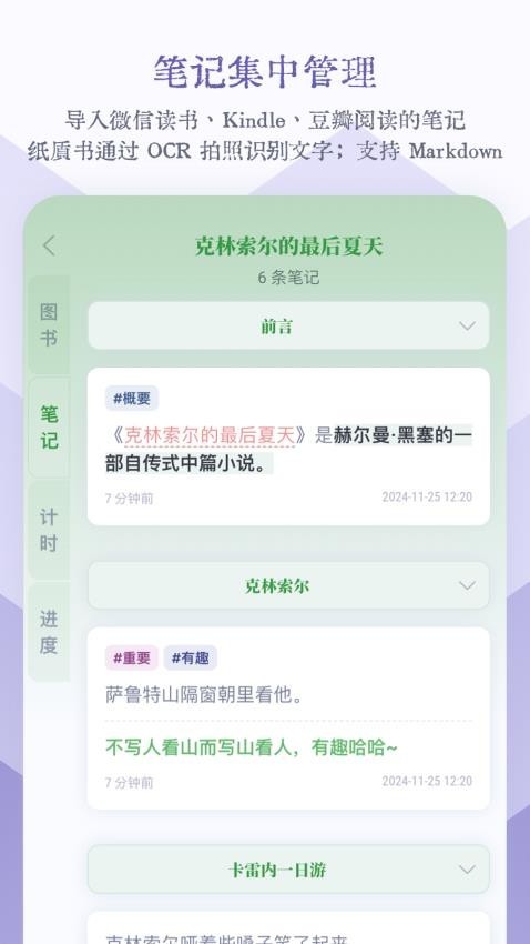 一款专注于读书笔记记录与管理的工具类软件,助力用户高效记录.梳理和重温阅读收获。通过笔记书写与管理培养阅读习惯和计划,完整记录阅读经历,搭配趣味化设计激发阅读兴趣,成为陪伴用户深度阅读的专属助手,快来体验一下吧。