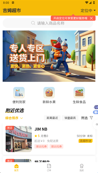 吉姆超市是您购物的好帮手,琳琅满目的商品只需要你动动手指头,就可以在手机里面下单购买,推荐附近评分比较好的超市,将该超市的特色全部展现在你的面前,还可以领取优惠券。用户也可以收藏自己喜欢的商品,还可以进行分类搜索到你需要的商品,软件里面还可以点熟食外卖,用户的吃喝玩这里全部都可以满足,有需要的用户可以下载试试看!