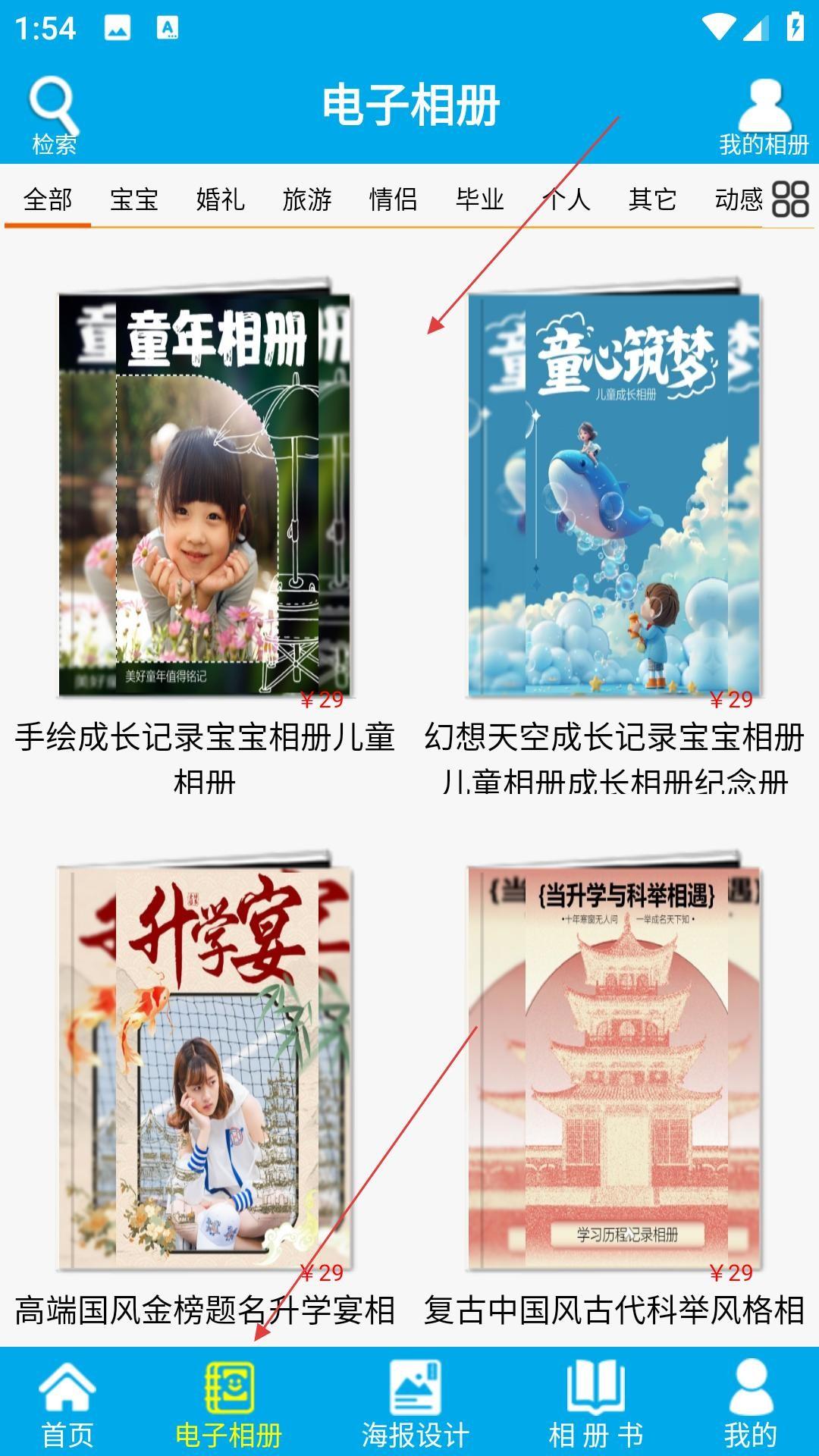3、电子相册界面,有宝宝、婚礼等多种分类标签,展示了多款相册模板,用户可根据需求选择合适的模板制作电子相册。