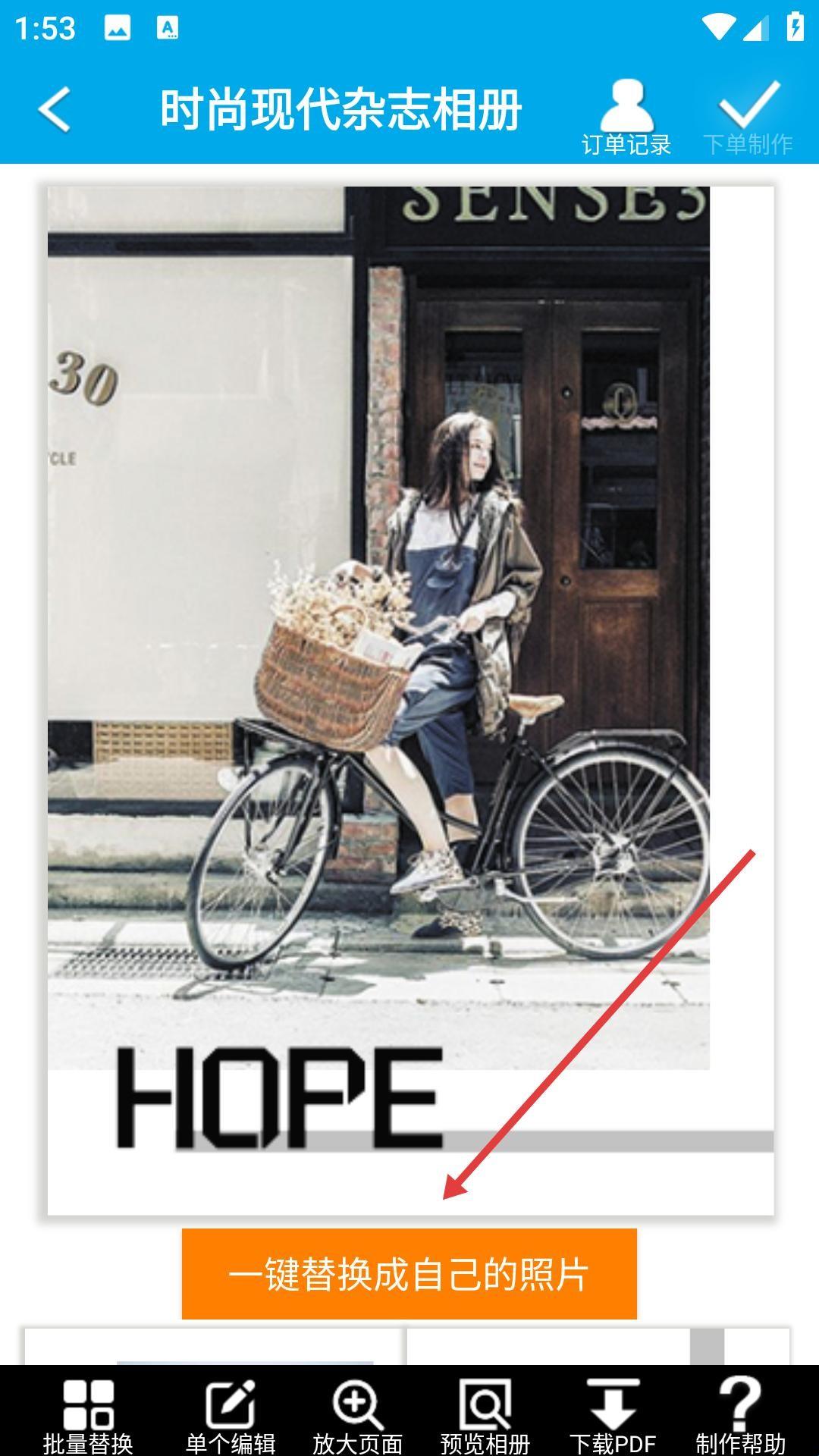 2、时尚现代杂志相册制作界面,展示了一个相册模板,用户可点击一键替换成自己的照片来制作相册,还有批量替换、单个编辑等功能按钮。