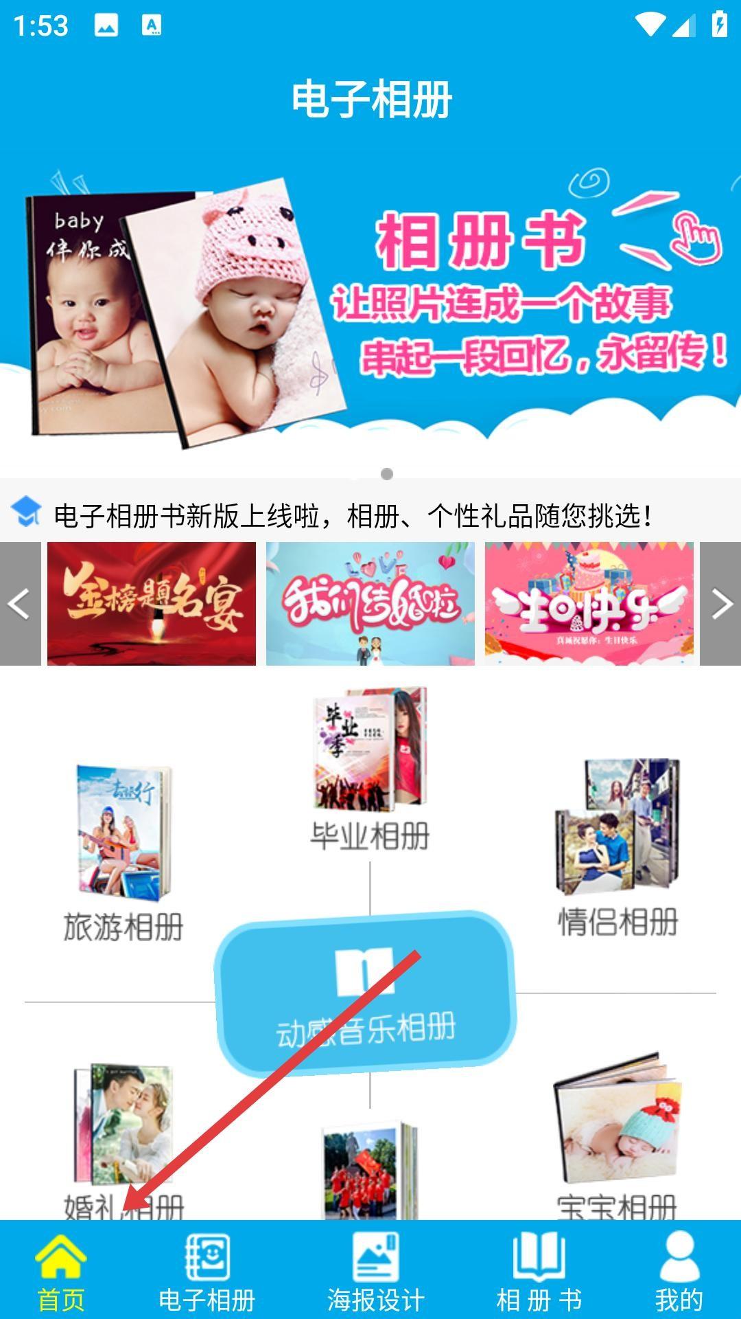 1、首页界面,有毕业相册、旅游相册等多种相册类型入口,还有动感音乐相册板块,方便用户制作不同主题的电子相册。