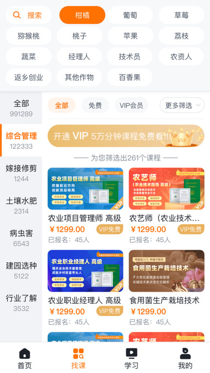2、课程学习-丰富的视频、音频课程,多元化的学习方式,让您足不出户学到更多种植管理技术