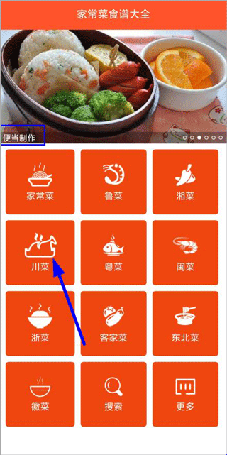 1、下载打开家常菜食谱大全app,首页是各种菜系分类以及餐品制作合集,点击喜欢的菜系;