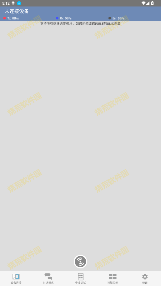 1、打开应用,会出现上图的界面。应用提供了一个蓝牙设备扫描和连接的界面,点击下方的圆形按钮可以启动扫描功能,扫描到的设备会出现在列表中。
