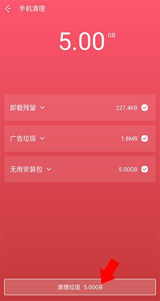 4、扫描完成之后,我们点击下方清理垃圾即可完成对手机内无用文件的清理
