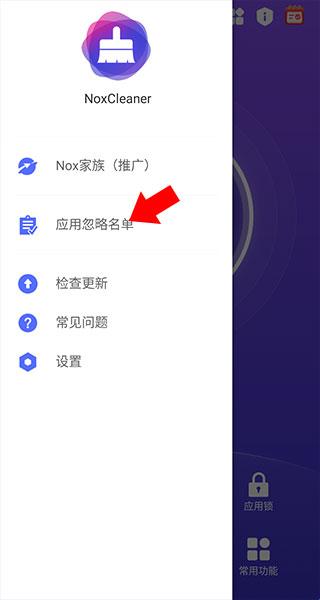 2、在侧边栏中选择应用忽略名单,并将、QQ等拥有聊天数据或者不想清理缓存的应用添加至忽略白名单中