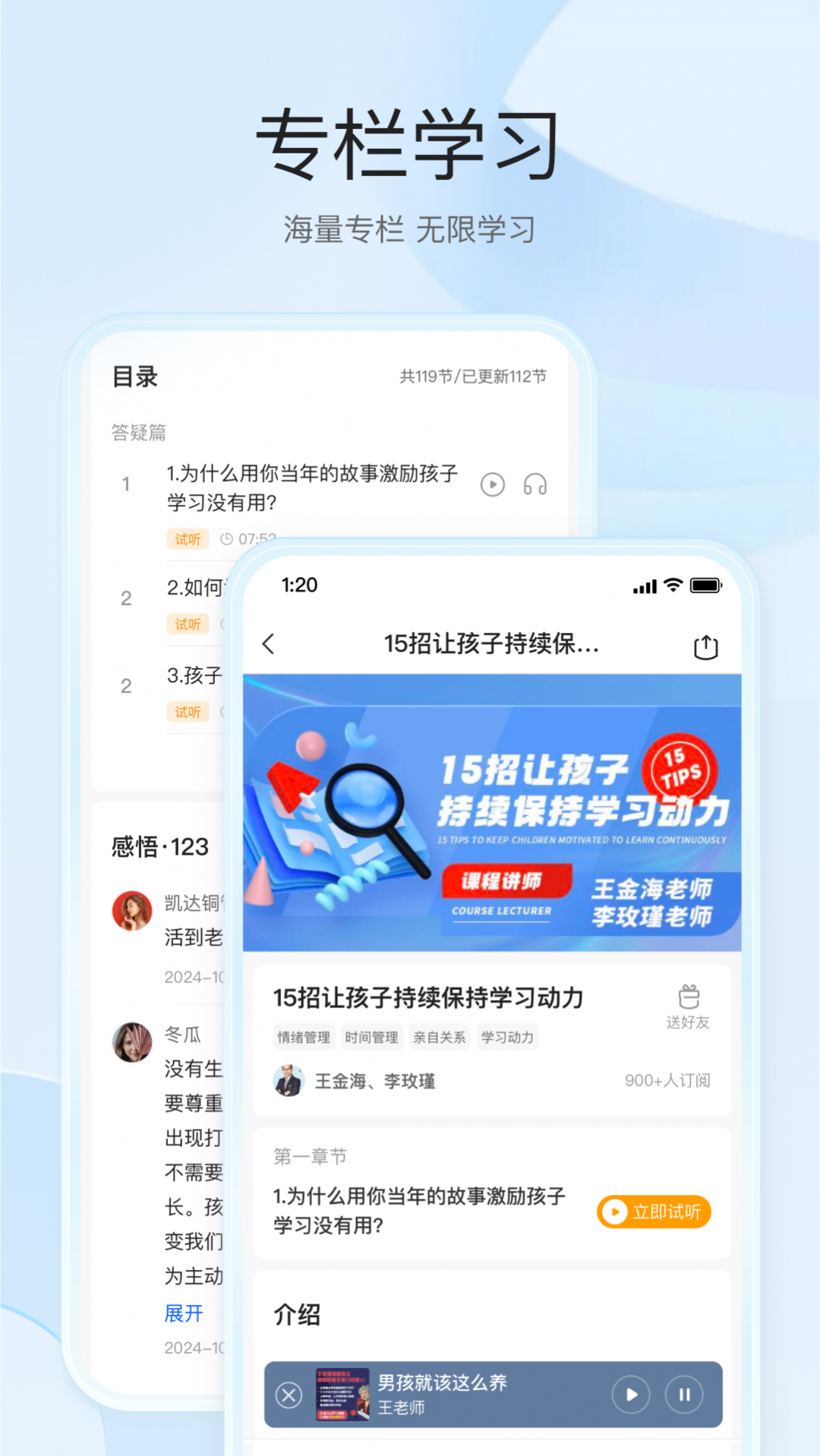 围绕家庭教育、母婴育儿、早期教育、夫妻关系、女性成长、学科提升、亲子课程、健康理财等领域,开创全新的父母提升、孩子学习教育板块,打造多维课程体系,覆盖全学科。