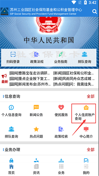 1、首先在本站下载安装好园区社保中心app,然后点击“个人住房账户查询”。