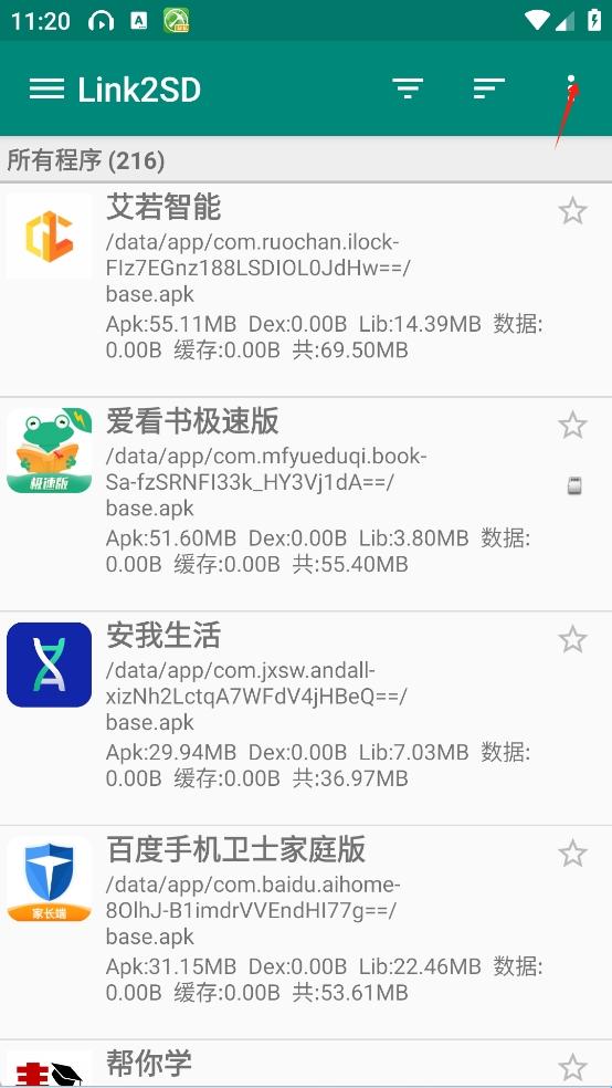 1、进入link2SD软件之后点击右上角的三个点。