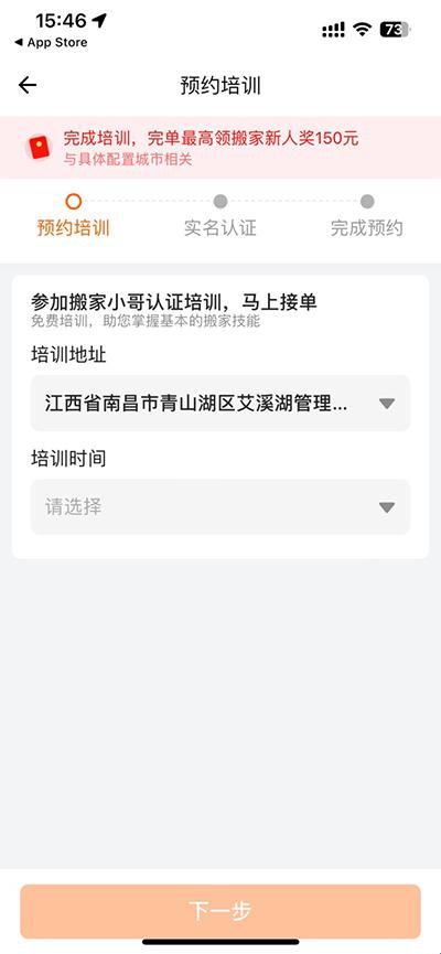 3、加入之后会自动跳转预约培训,可自行选择就近培训地址和时间,然后点击下一步;