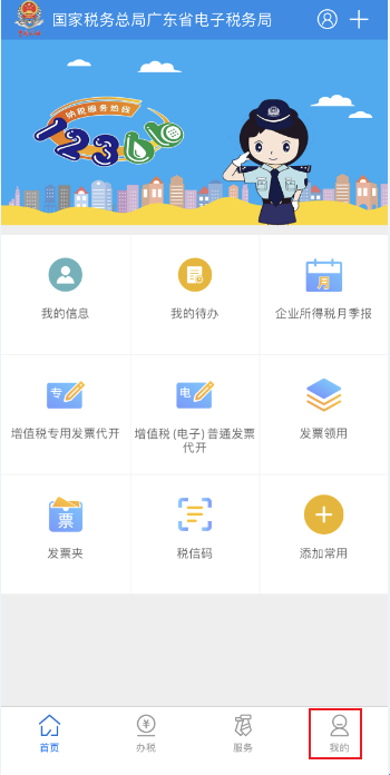 系统首页,功能主要有纳税人信息、发票查验、预约服务、办税指南、涉税咨询、电子税务局学习视频、最新资讯等(可以通过【更多】在我的应用编辑添加功能在首页)。