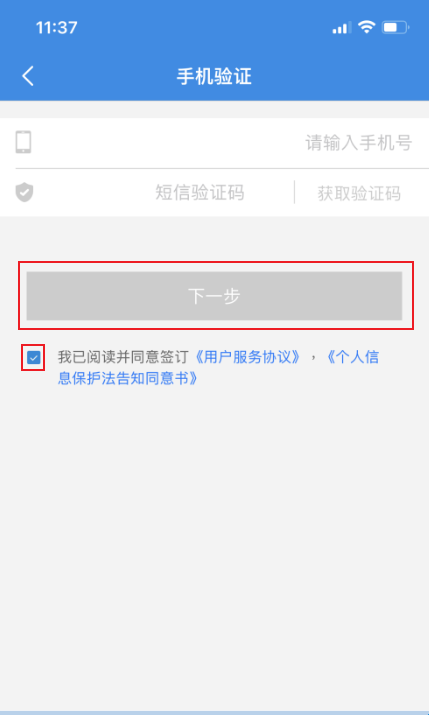 在注册页面,输入本人使用的手机号,接收手机验证码后,勾选“我已阅读并同意签订《用户服务协议》《个人信息保护法告知同意书》”,点击【下一步】;