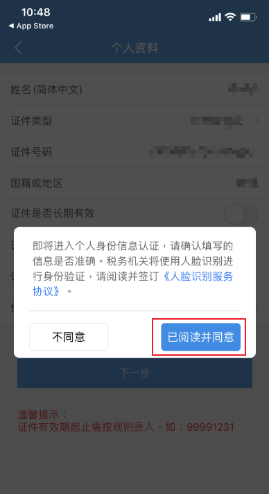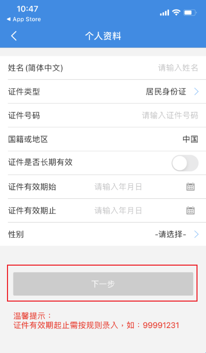 进入实名信息采集页面,输入个人资料信息(填写姓名、证件类型、证件号码、国籍或地区、证件有效期起止和性别等信息),填写完整后点击【下一步】;