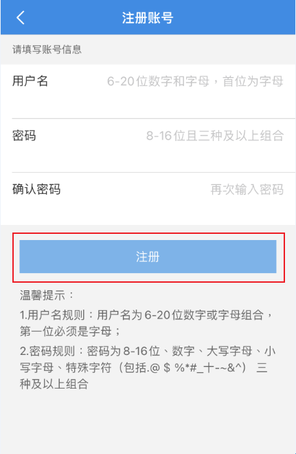 完成人脸识别后,进入注册界面,按照要求设置登录用户名和密码(注意:用户名设定后不可修改),完成后点击【注册】即可完成注册流程。