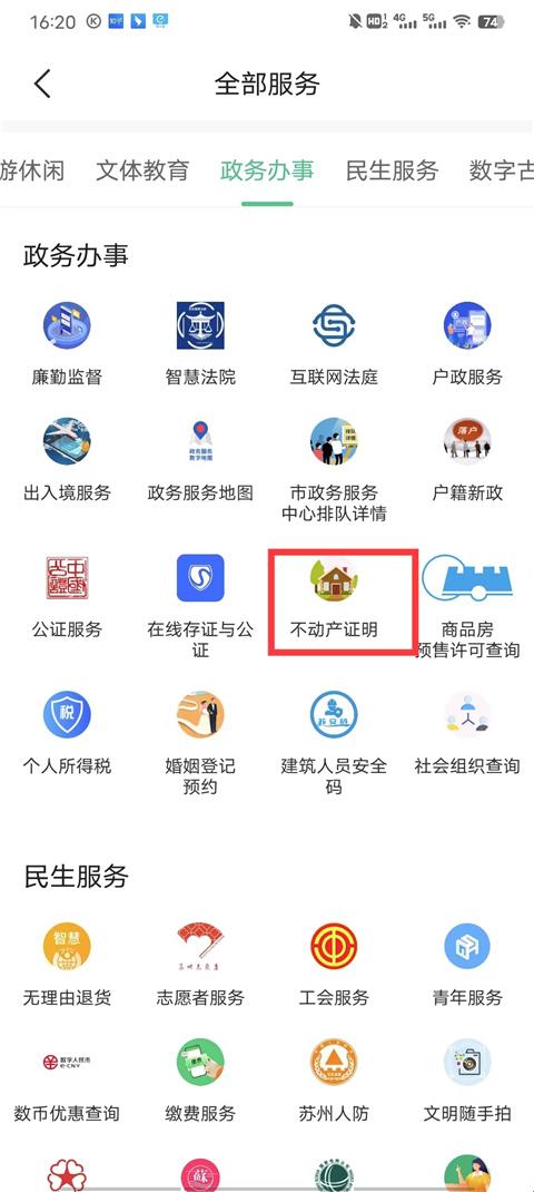 2、找到政务办事选项卡,点击不动产证明图标。