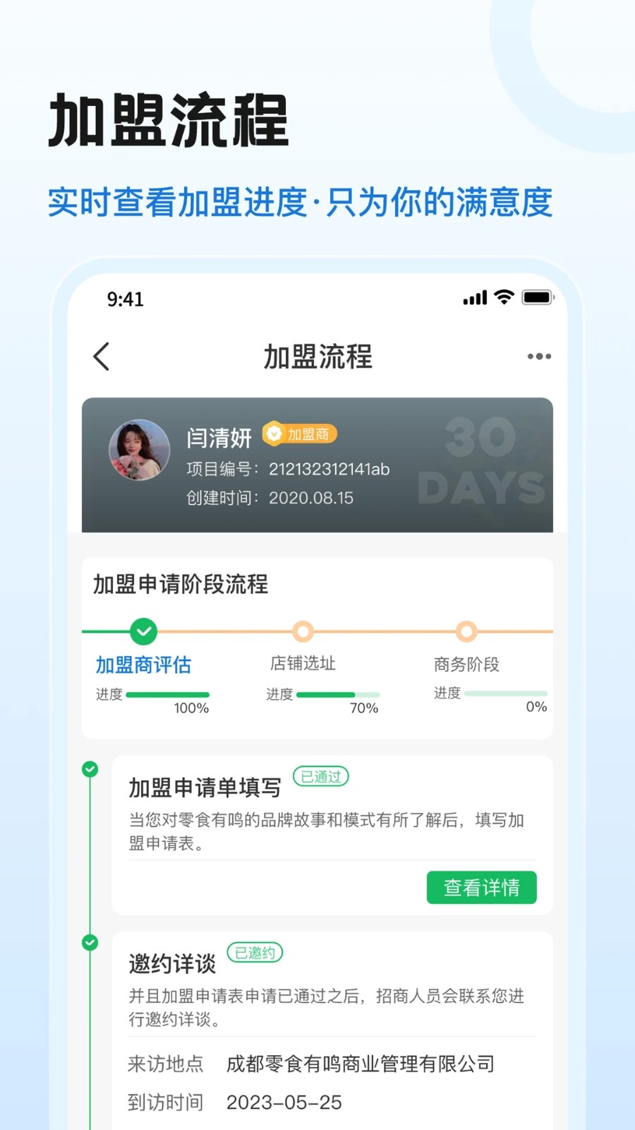 6、简单的申请模式让用户快速完成加盟申请,并享受贴心服务。