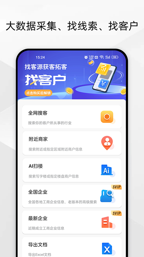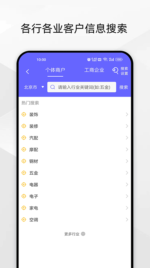 电销客源app是一款电销获客工具,具备大数据搜索、客户采集、数据导入保存等功能。支持多种搜索方式,快速定位潜在客户,提高拓客效率。覆盖全国经销商、代理、客户资源,一键搜索,自动匹配。适用于找客源、找人脉、企业查询、推广销售等场景,帮助销售群体高效完成业务拓展与客户管理。