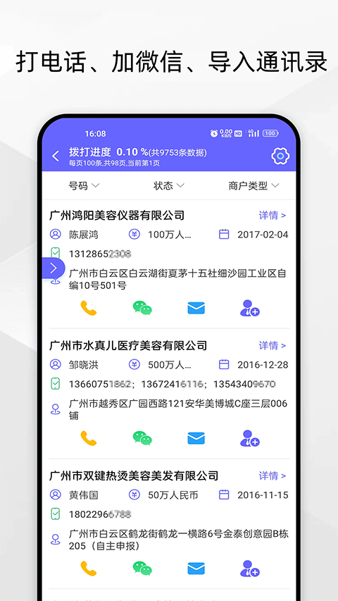 2、支持对客户信息进行批量保存,将客户电话一键导入到通讯录中;