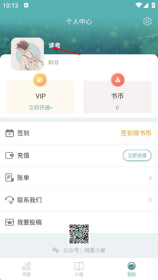 3、在个人中心页面点击读者字样,进入验证码登录页面。