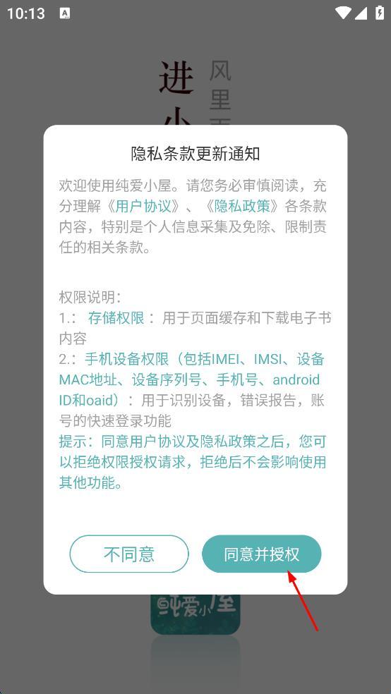 1、打开纯爱小屋App,出现隐私条款更新通知弹窗,阅读后点击同意并授权按钮。