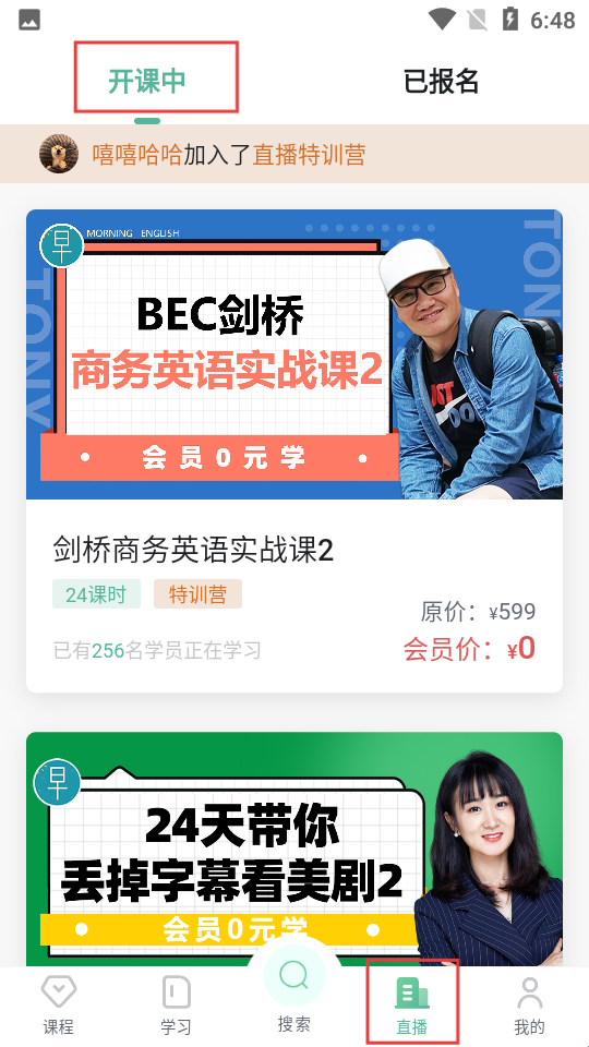3、直播页面开课中板块展示如剑桥商务英语实战课2等课程,含课程详情、价格及学员学习人数等信息。