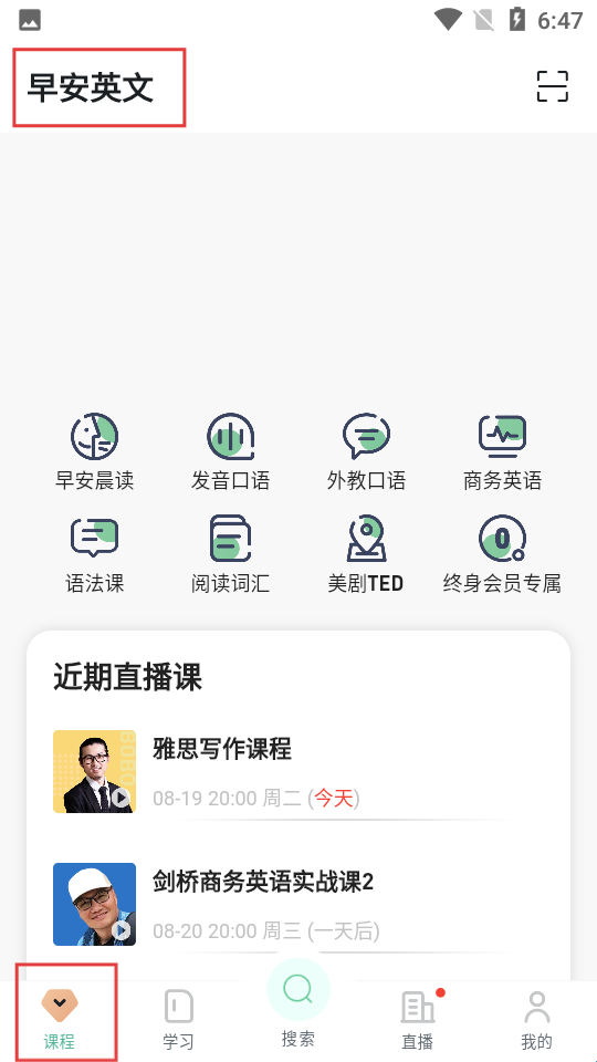 1、课程界面上方标有早安英文,下方排列着早安晨读、语法课等丰富课程,还展示了近期直播课安排。