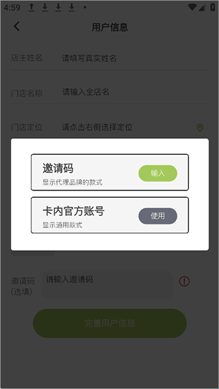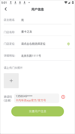 2、输入友商老板的姓名、门店等信息,上传相关照片,然后通过输入邀请码,如果没有可以点击邀请码旁边的红色感叹号,就可以获取到通用邀请码