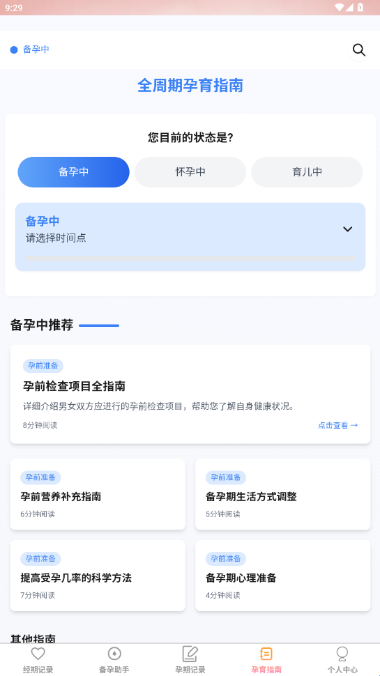 备孕助手:备孕助手模块用于计算当前日期的生理状态和受孕概率,让您了解排卵期及受孕机会。同时,提供有关饮食、健康和生活方式的建议,以提高成功受孕的机会。