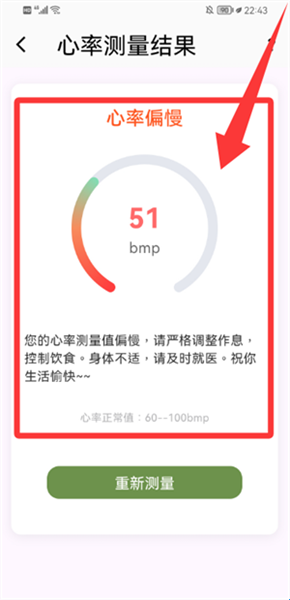 3、获取心率结果与健康提示,核对数值正常范围。