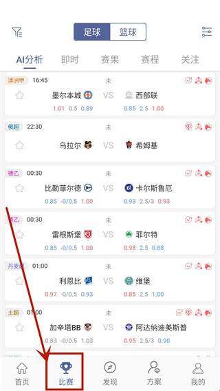 3、在比赛栏可以查看足球与篮球的各种赛事分析,同时还可以查看近期的各种赛程安排。
