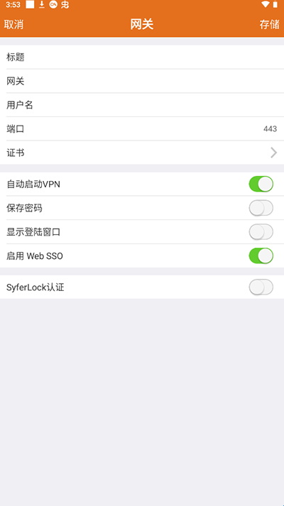 2、然后进行配置,主要设置项就是网关和用户名(一般就是学号)了,标题随便写,其他的都不用管(端口默认443即可,一般不会变):对于网关来说,可以先进入校园网的VPN登陆界面,输入用户名(学号)、密码登陆后网址就会变成域名,如下图,为202.204.105.45,一般来说这样得到的就是网关了。
