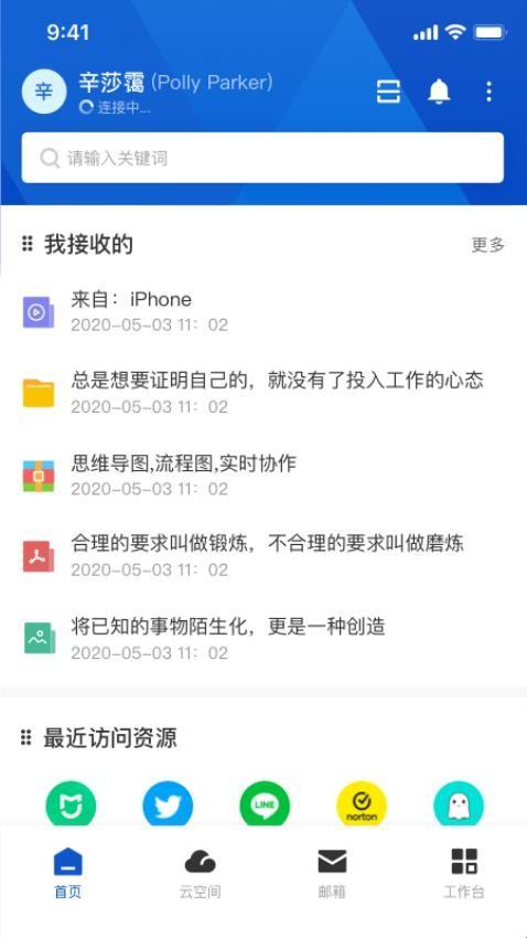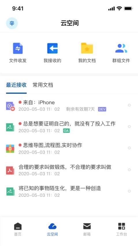 2、云空间:平台提供了线上的云空间,能够帮助用户接受需要的文件数据。