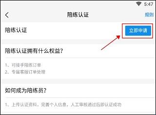 2、进入“陪练认证”后,详细阅读规则之后,点击“立即申请”。