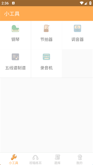 1、小工具:包含钢琴、节拍器、调音器、五线谱制谱、录音机等工具,为音乐学习者提供乐器模拟、节奏辅助、音准调节、谱子制作和音频录制等实用功能。