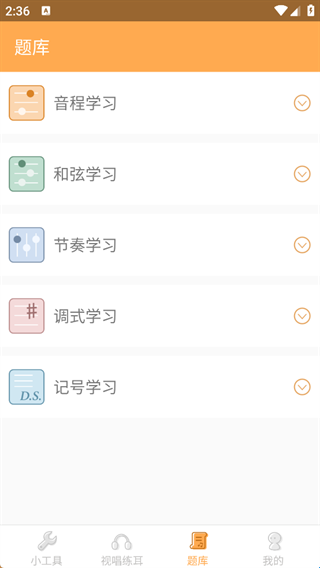 3、题库:设有音程学习、和弦学习、节奏学习、调式学习、记号学习等板块,通过丰富的题目帮助学习者系统巩固音乐理论知识。