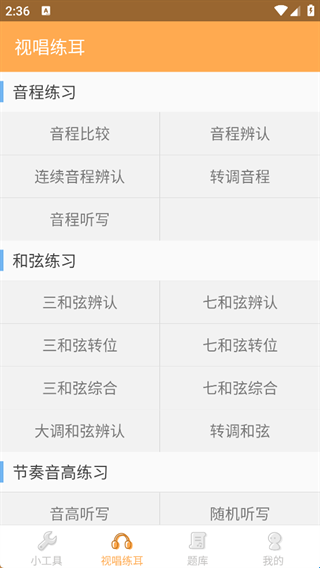 2、视唱练耳:提供音程练习、和弦练习、节奏音高练习等,涵盖音程比较、辨认、听写,和弦辨认、转位、综合,以及音高、节奏听写等练习项,助力学习者提升视唱和听觉辨识能力。
