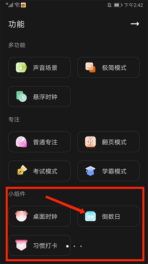 2、在功能界面,可看到小组件分栏,包括【桌面时钟】、【倒数日】和【习惯打开】,用户可根据需求选择相应的类型,这里以【倒数日】为例。