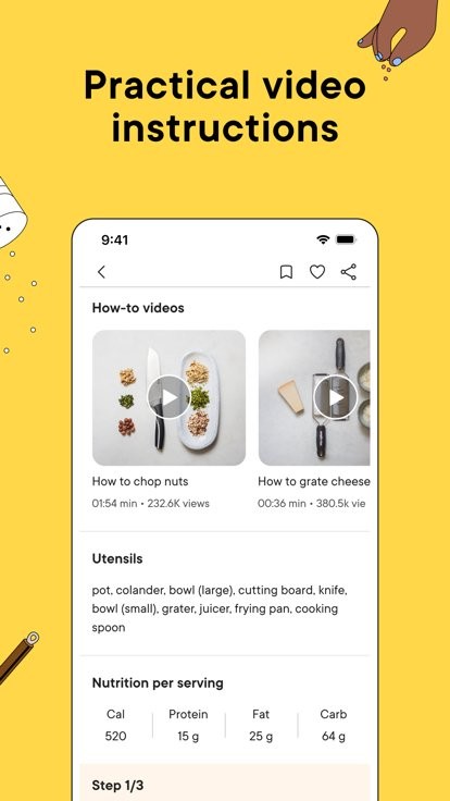 被数百万用户所喜爱的Kitchen Stories拥有经验丰富的厨师,让喜爱烹饪的用户能够提高自己的厨艺,发现新的美味食谱,从而找到烹饪的灵感。所有食谱都非常容易操作并附有精美的图片。按照图片、视频与小贴士的一步步指导便可轻易掌握烹饪方法。