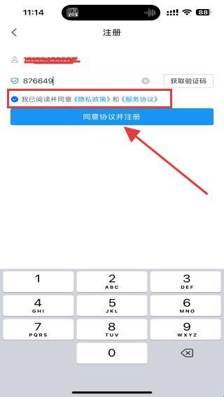 4、注册前,需要勾选我已阅读并同意隐私政策、服务协议,再点击同意协议并注册的按钮。