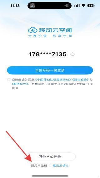 1、打开移动云空间APP,点击下方新用户注册的按钮。