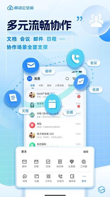 移动云空间,是面向全行业用户提供的一站式企业移动办公与应用聚合平台,以企业协作管理场景为入口,提供云盘、即时通讯、视频会议、文档、日程等基础办公协作工具,并聚合海量应用,让组织沟通更高效、数据管理更安全、企业协作更流畅、业务运转更灵活。