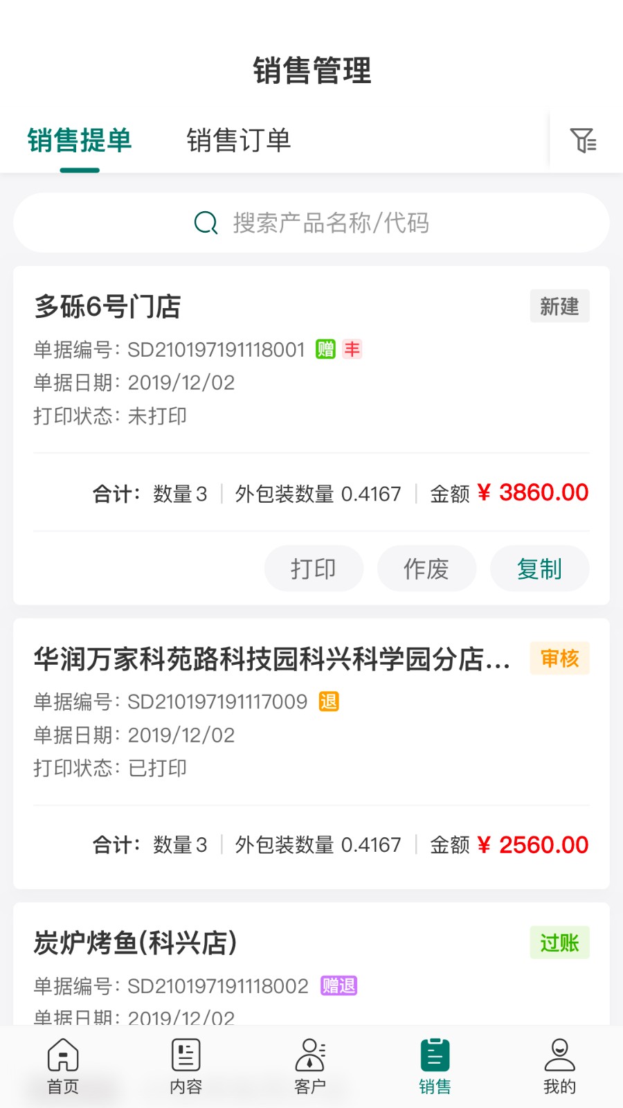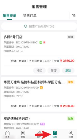 4、销售管理页面清晰列出销售提单与订单记录,支持快速查询、打印与复制等常用操作。