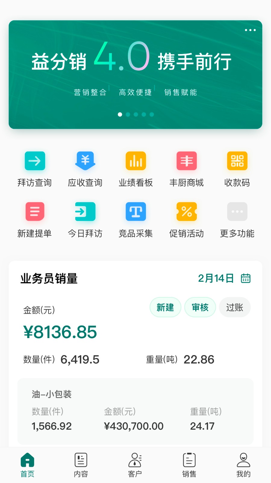 2、首页汇集拜访查询、应收账款、业绩看板等核心功能模块,方便业务员快速执行日常任务。