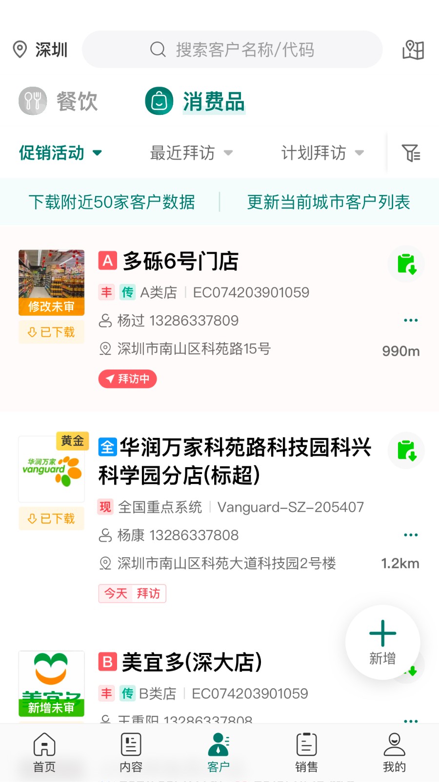 3、客户信息页展示客户地址、类型、拜访记录与促销活动等数据,便于业务员全面了解客户情况。