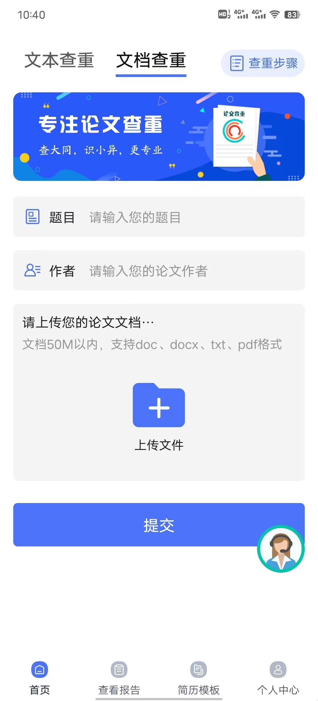文本查重内容字数在500字~10000字;文档查重文档在50M以内,支持doc、docx、txt、pdf格式。