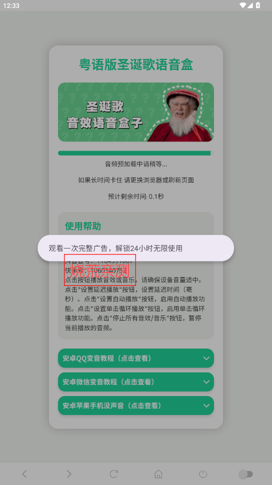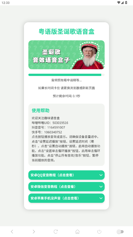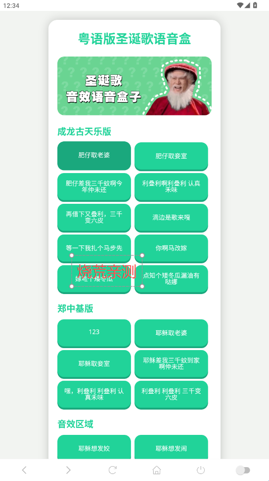 节日氛围感满满的语音盒子软件,圣诞歌语音盒app是由鸡乐盒作者新开发的一个语音盒子,整合了各种有趣的粤语版圣诞歌,有成龙,古天乐版,郑中基版,还有很多有趣的音效,可根据自己的喜好进行设置播放效果,延迟播放,自动播放,循环播放等操作。